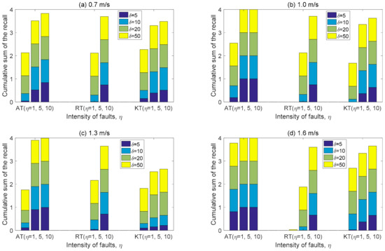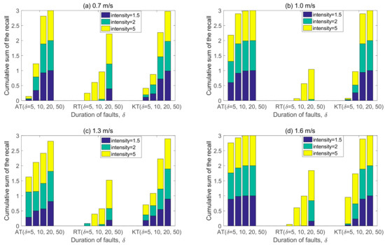 Recall according to each duration as a function of random fault intensity: (a) Cumulative sum of the recall at 0.7 m/s of Jackal UGV; (b) Cumulative sum of the recall at 1.0 m/s; (c) Cumulative sum of the recall at 1.3 m/s; (d) Cumulative sum of the recall at 1.6 m/s.