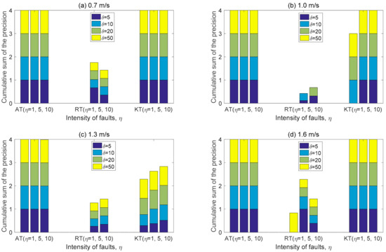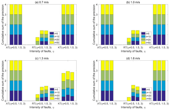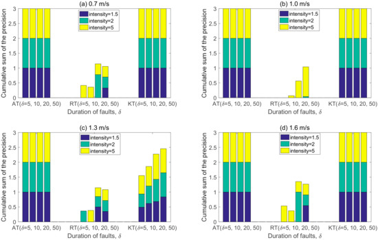 Precision according to each intensity as a function of constant fault duration: (a) Cumulative sum of the precision at 0.7 m/s of Jackal UGV; (b) Cumulative sum of the precision at 1.0 m/s; (c) Cumulative sum of the precision at 1.3 m/s; (d) Cumulative sum of the precision at 1.6 m/s.