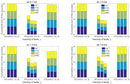The accuracy of the random fault detection is presented in Figure 7. At all velocities except for 0.7 m/s of the velocity, AT achieves the best performance close to 100% when exceeding the intensity of a certain magnitude (. As with constant faults, AT has lower performance than KT only in the shortest duration and velocity ( and it seems to be due to the slightly high threshold of AT at the lowest velocity. From Equation (11), when = 1 is applied, the random faults with one value in the range of ] are generated by about 47% of the total random faults and random faults in the range of ] account for about 82%. Hence, when = 1 is applied, these results are so meaningful in terms of sensitivity to small changes. The ability to identify them is superior at all velocities compared to other methods when the faults with the magnitude similar to that of the original data are injected. Obviously, the larger the intensity is, the closer to 100% the performance of AT is.