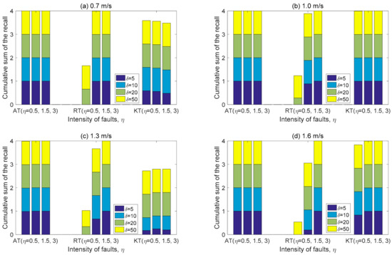 Recall according to each intensity as a function of constant fault duration: (a) Cumulative sum of the recall at 0.7 m/s of Jackal UGV; (b) Cumulative sum of the recall at 1.0 m/s; (c) Cumulative sum of the recall at 1.3 m/s; (d) Cumulative sum of the recall at 1.6 m/s.