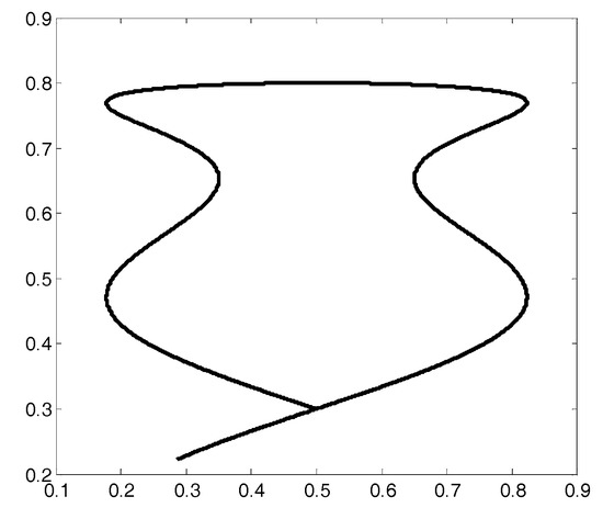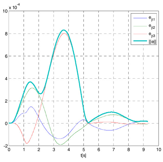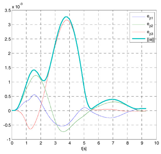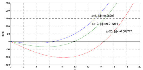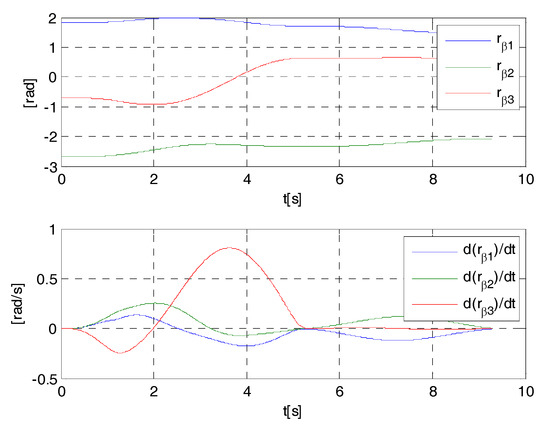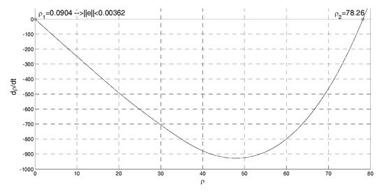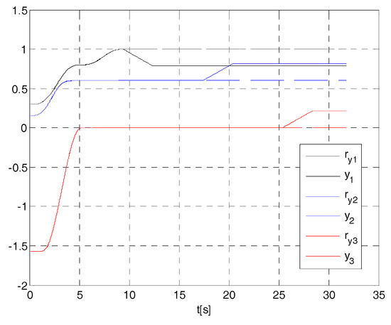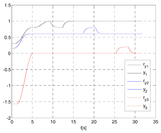 It is easy to verify that for , the control system is unstable, while for , the control system is stable (see Figure A2). For , it is: , i.e., if the time constant of the actuator is equal to in the hypothesis of real actuator (A11), the dynamic matrix A has a couple of dominant eigenvalues equal to the poles of the closed-loop system (A14).
