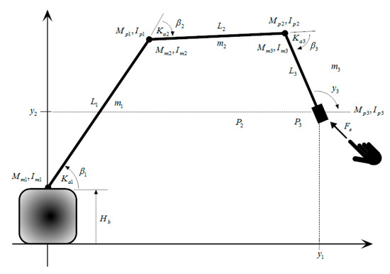 whereis the generalized coordinate vector,is the generalized control forces vector,is the generalized gravity forces vector,is the generalized disturbance forces vector,is the inertia matrix,is the vector of the damping, centrifugal and Coriolis forces,is the vector of the possible stiffness forces,with,are transmission matrices of the generalized forcesand, and, finally,is the vector of the uncertain parameters.