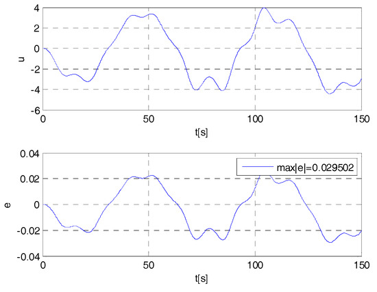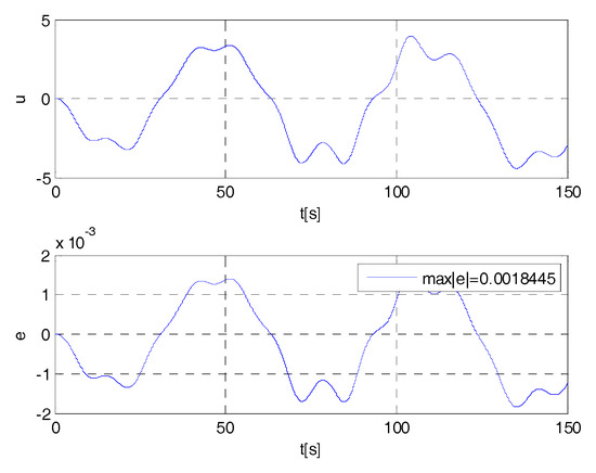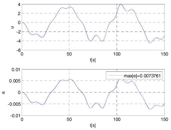 From Figure A8 and Figure A9 and from the corresponding Figure A6 and Figure A7 it emerges how the performance of the control system with a controller designed by using the stated theory and implemented by using a PWM modulator are better, both regarding to the amplitude of the control signal (see Figure A1, as well) and the precision, than the performance obtained with a controller designed with the control techniques using high frequency and high-amplitude control signals (e.g., [4,10,14,31,40,41] and related references therein) and implemented with commutation devices with evaluation of the sign at finite frequency.