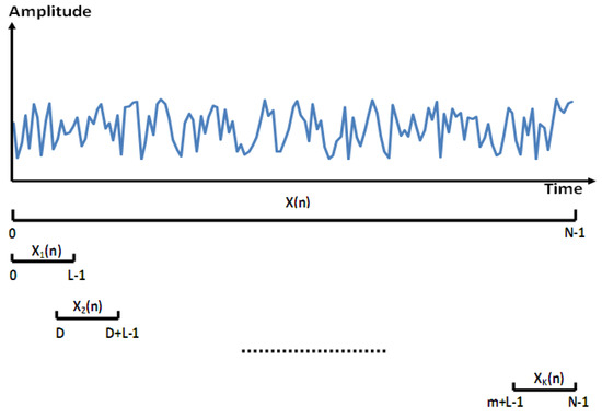 For X(n), a second-order stationary random discrete signal of zero mean , we take overlapping segments of length L. The starting points of these segments are multiples of D as illustrated in Figure 2. We assume that we have K segments, and that they cover the entire record, as described in Equation (1).