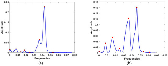 After analyzing the 1044 available signals, we extracted the 8 most predominant peaks of the power spectral density (pointed out by triangles in Figure 3). Two values were used for each peak: the characteristic frequency and the value of the spectral density, which gave 16 features for each signal. The data were then organized in a matrix of 16 columns and 1044 rows.