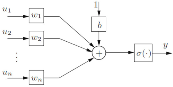 where denotes the neuron inputs, b is the bias (threshold), denotes the synaptic weight coefficients, σ is the nonlinear activation function such that sigmoid and hyperbolic tangent functions.