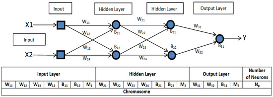 As an example, consider a network with three layers of neurons with two inputs, two neurons in each hidden layers and one neuron in the output layer (Figure 6). We set the maximum number of layers to 3 and the maximum number of neurons in each layer to 2. The length of the chromosome is therefore 19.