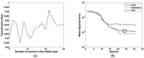 Several tests were performed by changing the number of neurons in the hidden layer each time. The optimal neural network is composed of 16 neurons in its hidden layer (Figure 7a). This network converged after 24epochs with Mean Squared Error MSE = 0.0124 (Figure 7b).