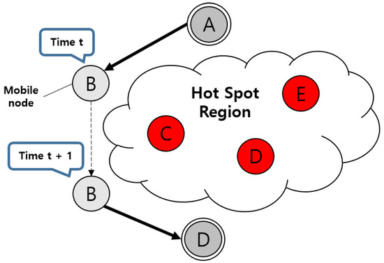 As alternative scheme for dynamic topology, M-ATTEMPT [8] has been proposed to address the dynamic network topology changes in WBAN. In M-ATTEMP, the tree is constructed according to a node’s joining or departure whenever a person changes his/her gesture. Furthermore, in the case that a node’s temperature approaches the pre-defined threshold, all nodes prevent its temperature rise by disconnecting all links with neighbor nodes during the next few rounds until the temperature turns normal. However, this approach has a problem because a node’s function cannot be performed when a node disconnects all links with neighbor nodes. On the other hand, MTR [9] utilizes the movements of the human body in the routing process. MTR defines two types of nodes: mobile node and static node. The mobile is attached to arms and legs while the static node is fixed body parts with no mobility. When the temperature of all neighboring static nodes exceeds the pre-defined threshold, a mobile node is selected as a next hop in order to forward the data to the sink node directly by adapting store and carry scheme. MTR uses routing cost P that is calculated by multiplying pre-defined weighted factor and connection time between a source node and a mobile node. It is to prevent the data loss caused by movement of the mobile node. Figure 2 illustrates the routing process in MTR. If source node A is surrounded by hot spots, node A forwards the packet to mobile node B, and then node B stores the packet in its buffer until it is connected to the sink. Otherwise, all packets from node A are forwarded to a static node with lowest temperature. However, the store and carry scheme has a drawback in that the emergency sensor data may be delayed if it is delivered by a mobile node.