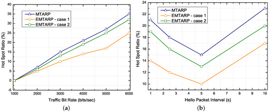 Performance comparison for difference traffic bit rate and hello packet interval. (a) Impact of varying traffic bit rate on hot spot ratio, (b) Impact of varying hello packet interval on hot spot ratio.