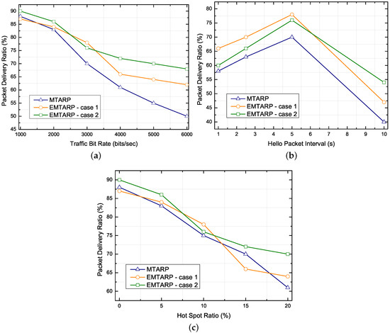 Performance comparison for difference traffic bit rate, hello packet interval and hot spot ratio. (a) Impact of varying traffic bit rate on PDR, (b) Impact of varying hello packet interval on PDR, (c) Impact of hot spot ratio on PDR.