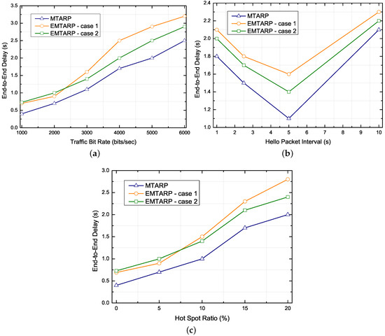 Performance comparison for difference traffic bit rate, hello packet interval and hot spot ratio. (a) Impact of varying traffic bit rate on end-to-end delay, (b) Impact of varying hello packet interval on end-to-end delay, (c) Impact of hot spot ratio on end-to-end delay.