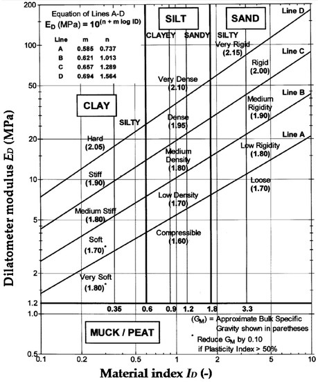 - Briaud, J.; Miran, J. The Flat Dilatometer Test; Report No. FHWA-SA-91-044; US DOT Federal Highway Administration: Springfield, VA, USA, February 1992; pp. 1–102.