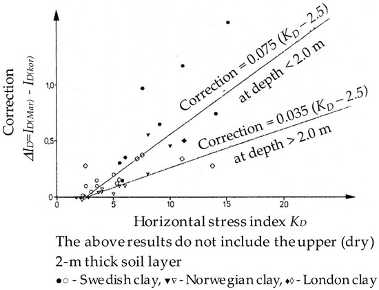 Difference between material index (ID(Mar)) and material index ID(kor) for different clay content depending on the horizontal stress index KD [7].