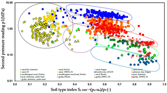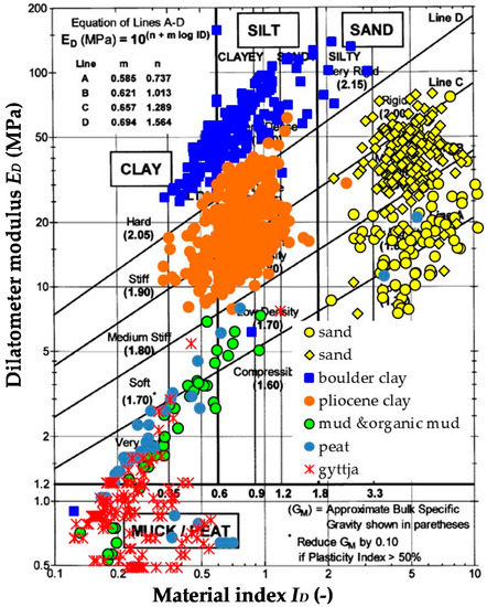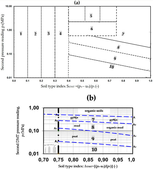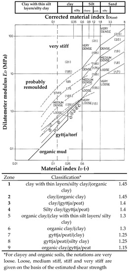 In order to create a mechanism for sub-dividing the area for each soil, a new interpretation of dilatometer results was proposed as follows by introducing the values p1 (MPa) and StDMT = (p0 − uo)/p1. Namely, it was necessary to enter p1 (MPa) values on the vertical axis and StDMT = (p0 − uo)/p1 values on the horizontal axis. On the basis of this technique, it can be noticed that in the case of non-cohesive soils, results similar as in Marchetti’s nomogram will be obtained. However, for both cohesive soils and organic soils, this new approach gives a clear subdivision of the area for a specific soil. As shown in Figure 10, seven areas may currently be distinguished. The areas are depicted by variously coloured dashed lines: the line in black represents non-cohesive soils, the line in blue stands for silt soils, the line in brown represents clay soils, the line in violet is the transition area, the line in red is gyttja, the line in green is mud and organic mud, and the line in grey represents peat.
