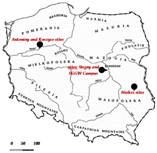 This paper presents the test results of mineral and organic subsoil obtained from Antoniny and Koszyce sites located in the Noteć river valley in the Wielkopolska province, Nielisz site located in the Wieprz river valley in Lublin province, the SGGW Campus with the Department of Geotechnical Engineering SGGW, and the Stegny site located in Warsaw, where a laboratory and field testing programme has been carried out under and outside of the main dam embankment [26,27,28]. The location of all analyzed objects is shown in Figure 5. The grain size distribution curve obtained from laboratory tests for mineral soil from the described sites is presented in Figure 6.
