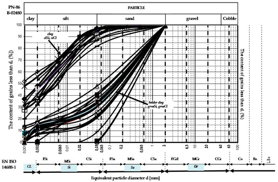 Based on laboratory tests, Figure 4 shows the grain distribution curve for all analyzed objects.