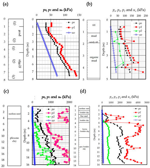 Profiles of p0, p1 and p2 from dilatometer (DMT) and hydrostatic pressure uo tests: (a) for the Antoniny site; (b)—for the Nielisz subsoil; (c)—for the Stegny subsoil; (d)—for the SGGW Campus subsoil [30,31].