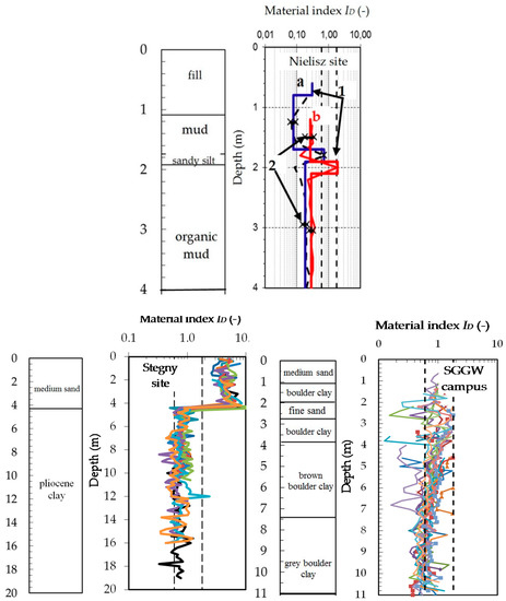 Profiles of material indexes ID from the DMT tests carried out for the subsoil of the Nielisz, Stegny and the SGGW Campus sites: (a)—before loading, (b)—after loading for Nielisz site; 1—measured values, 2—average values ± one standard deviation.