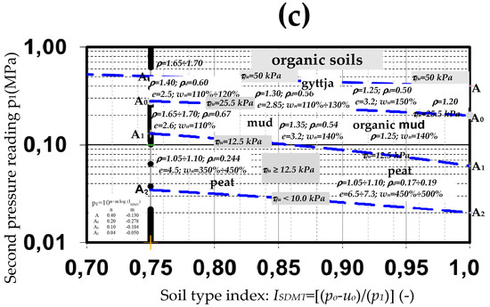 To recognize the residual mineral soils and organic soils in a more detailed manner compared to Marchetti and Crapps [2], the proposed diagram shows the relationship between the second reading p1 and the soil type index ISDMT (Equation (11)). The ISDMT soil type index values can be calculated using Equation (11). Subsoils are classified as organic soils when the soil type index 0.40 < ISDMT ≤ 1.0 and the second pressure dilatometer reading p1 is in the range of 0.01 MPa < p1 ≤ 1.0 MPa (Table 4 and Table 5). The new diagram contains 10 areas: 1 ÷ 4—non-cohesive soils, 5—silt, 6—clay, 7—gyttja, 8—mud/organic mud, and 9 ÷ 10—peat (Figure 11a–c). For a more precise subdivision of organic soils, an additional nomogram chart was developed for areas 7, 8, 9 and 10. The detailed form and the use of this nomogram chart is shown in Figure 11b,c.