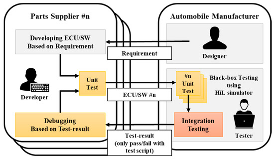 Figure 1 shows the process of electronic component development and testing utilized by the automotive industry and OEMs. The developer receives the requirement from the designer and develops the ECU/SW. The tester receives the developed ECU/SW and uses the Hardware-in-the-Loop (HiL) simulator to test unit or integrated functions without source code. The faults detected during the test are then reported to the developers for modification [3]. At this time, the test results that the tester reports include only the test script and the corresponding pass/fail information (i.e., the expected value for a test condition and the actual output value of the ECU/SW). Therefore, the developers need to rebuild the same testing scenario to correct the reported failure. If the tester can provide debugging information on the internal operations when a failure occurs, the developer can easily resolve the cause of the failure [4].
