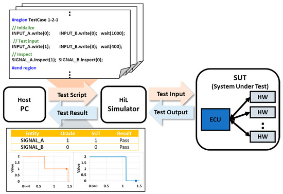 The performance of automotive software is affected by both software and hardware problems. Therefore, the software must be evaluated on actual hardware and its behavior must be tested and verified. The test is performed according to the overall integration level under development. The HiL test is a method for evaluating the hardware on which software is installed [10]. The HiL test constructs the physical environment in which the hardware operates with a simulator and evaluates whether the hardware meets certain input and output requirements [6]. Figure 2 shows an example of an HiL test environment. The host PC provides the test script to the HiL simulator. The HiL simulator then gives an input signal to the system under test (SUT) based on the script and it confirms the result. If the output value is equal to the expected value, a “pass” is delivered; otherwise, a “failure” is delivered to the host PC. This process runs automatically based on the script. However, an HiL test that utilizes such a simulator can only evaluate the output as the input of the defined SUT. In other words, if a fault occurs, there is no information on the internal operation that causes the fault. The results only include inputs that do not meet the requirements (i.e., the expected value—the oracle). Therefore, when a fault occurs during an HiL test, it is necessary to hunt for the internal operation of the employed SUT.