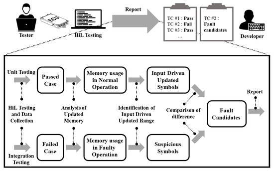 At the first step, we perform HiL testing and data collection. As a result, we collect test results, test scripts, memory data and executable files of the software used for testing. Next, we perform static analysis of the executable file to extract the symbol names and their assigned addresses. Then, we analyze the memory snapshots that are periodically dumped and compute the update frequency of the specific address. In this step, the analyzed result is used to map the assigned addresses and symbols and to generate memory update information for each address. The third step identifies the frame range of memory data that responds to the input of the function being tested. Here, there are two types of symbols: normally operated symbols and symbols suspected of operating abnormally within the frame range. The last step compares both memory update information of the previous stage. If the suspicious symbols are different from the memory-updated information in normal operation, they can be regarded as abnormal; these symbols are called fault candidates. In the last stage, the memory-updated information on symbols determined to be abnormal is provided as the fault candidates. The key is to find the fault candidates so that the developers can use them as debugging information.