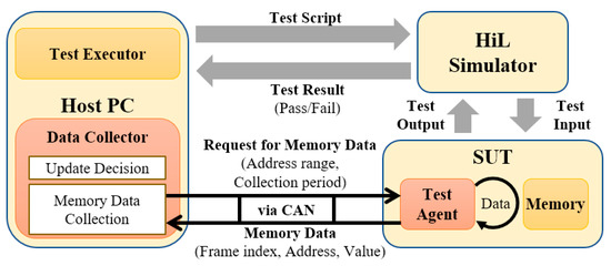 We have added a data collector and a test agent for obtaining memory data from the HiL test environment described in Section 2. In Figure 4, a test executor is expressed as a program that handles the test scripts instead of the host PC in the existing HiL test environment. A data collector and a test agent are responsible for collecting memory data. The data collector collects memory data from the host PC and determines whether they have been updated based on the changes in values. The test agent sends memory data within the address range to be observed in the SUT during the test time according to the request of the data collector. The communication between the test agent and the data collector uses a vehicle communication network, such as a CAN.