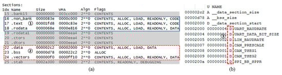 The executable file is statically analyzed to extract execution information from the software. The tester receives an executable file from the developer in a binary form rather than source code to test an automotive ECU/SW. To statically analyze an executable file, a binary utility is used [22]. For instance, the Objdump is used for the memory section table and the NM is used for the symbol list. First, we have to obtain a memory section table, which provides memory partitioning information based on usage, including structure information used by the executable. Figure 5a, which is an example of a memory section table, shows the section name, the size of each section, the start address (Virtual Memory Address, VMA) and characteristics such as alignment and flags. This section table contains information on the address range to be dumped. In the figure, “.text” in ① indicates the part where code is loaded on memory and ② is a section for variables used in software execution. The section of “.data” is for the variables with initial values and “.bss” is for the variables without initial values. The variable sections that can be updated with values that correspond to LHS are dumped and analyzed. At this point, our method focuses on the value changes in the address. Therefore, there is a limit to not using static addresses such as local variables in the stack and dynamic allocation variables in the heap. However, in the coding rules (MISRA-C: 2004 Rule 18.3, 20.4) for automotive software, it is recommended that memory should not be reused or dynamically allocated [23]. In this paper, we propose a fault localization method for static addresses only.