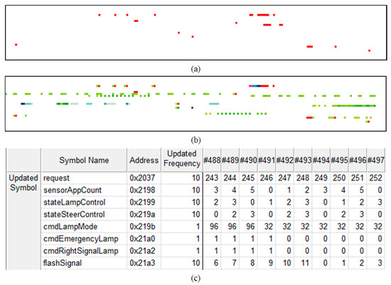 Figure 6 shows an example of MUI. Figure 6a,b are the memory snapshots in color. Figure 6a shows a set of MUA, n of n-th frame in red, which means “updated”. The addresses of the white area that look like the background means there are no changes in the values at that point of n-th frame. In (b), it is possible to identify the updated frequency of each address in the range of the full-frame. The updated frequency is visualized using different color palettes (white, yellow, green, blue, red). As frequency increases, the color changes from white to red and turns red if an address is updated on all frames. In (c), you can see the additional details of the MUI. The symbol “request” in the first line is assigned to address 0x2037 and the total number of updates is 10 because the value is continuously changed from #488 to #497 in every frame.