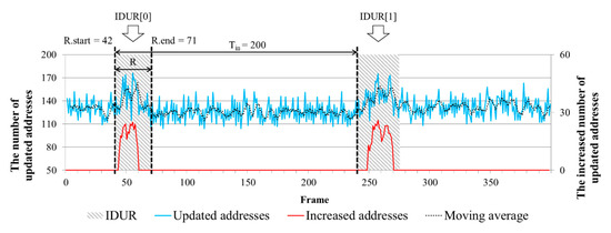 The blue line indicates the number of updated addresses throughout the frame and the dashed line shows the trend of the number using the moving average method. Looking at the 50th frame of the graph, you can see that the number of updated addresses increases and the number of updates increases again near the 250th frame after 200 frames (Tin = 200). This is obvious evidence that the input signal reflects the update of the memory value. Therefore, in order to handle only the data driven by the input, we need to find the exact range called IDUR. The algorithm of the proposed IDUR identification method is shown in Algorithm 2.