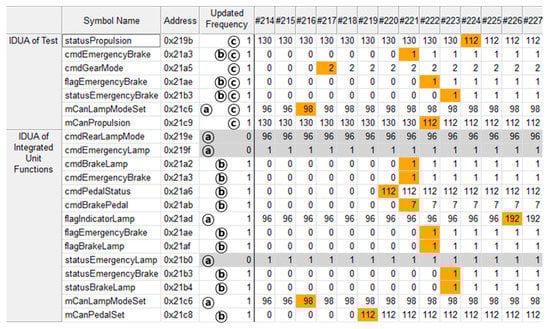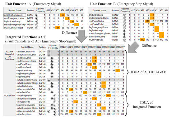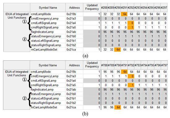 For example, the “Emergency Stop Signal” (ESS) is a function that quickly flashes the brake lamp in an emergency stop situation. Specifically, the “Advanced ESS” (Adv ESS) is connected to the function that automatically turns on the emergency lamp when the vehicle is completely stopped. At this time, the “Adv ESS” consists of an integrated function of “ESS” and “Emergency Signal”. Therefore, by observing the IDUA of the integrated function, the cause of the fault in the “Adv ESS” can be found. Figure 8 presents an example of fault candidates for the “Adv ESS”. It shows the MUI for the IDUA of each “Emergency Signal” and “ESS” from the top of Figure 8. Each IDUA (from function A and B) is updated in order of the cmd* symbol, the flag* symbol and the status* symbol after the update of the mCan* symbol. Figure 8 also shows fault candidates for the integrated functions. The cells highlighted in yellow are the values that have changed in the address and the symbols highlighted as the shaded bars are the symbols that were not updated. The FC contains the union of IDUA of each unit function and the symbols belonging to each unit function are marked as ⓐ and ⓑ. Among these symbols, the symbols marked with ⓑ have been similarly updated for unit B and the integrated function but the symbols with ⓐ marks are not similar. There are symbols highlighted by the shaded bar in the symbols marked ⓐ and when you look at the highlighted cell of the symbol, you can see that the value of flagIndicatorLamp has been changed from 96 to 192. Therefore, the “ESS” (function B) is operated normally but it can be seen that a fault has occurred by connecting to the “Emergency Signal” (function A).