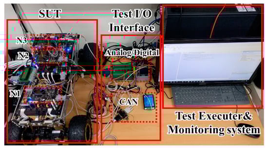 For the evaluation, we have constructed the SUT with an NXP MC9S12X [25] family ECU and OSEK/VDX-based SW. Figure 9 shows the HiL environment used for testing. As shown in the figure, the environment consists of an SUT with three ECUs, a test executor, a test interface and a monitoring system that collects and stores memory. Consisting of three separate ECUs, the SUT has 10 unit functions that handle steering and forward functions (N1), communication and vehicle propulsion (N2) and peripheral sensing and rearward functions (N3). Therefore, the memory region used by each unit function is statically allocated to each node.