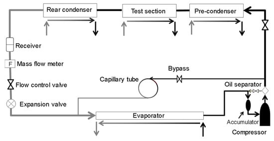 A schematic of the experimental setup is shown in Figure 1, a vapor compression heat pump system consisting of a refrigerant loop and four heat-source water loops. The refrigerant loop consists of a compressor, oil separator, pre-condenser, test section, rear condenser, liquid receiver, mass flow meter, expansion valve, and evaporator. Each heat-source water loop consists of a water tank, temperature control unit, water pump, and flow meters. The refrigerant flow rate is adjusted by the expansion valve, bypass valve, and rotational speed of the compressor.