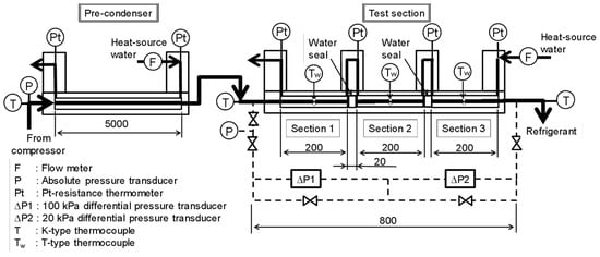 Details of the pre-condenser and test section are shown in Figure 2 for measurements using R1234ze(E), which is a double-tube heat exchanger consisting of three subsections with a length of 200 mm. In each subsection, a test tube is cooled by water passing through the annulus, while the refrigerant flows within the inner tube. Measurement lengths for the pressure drop and heat transfer are 800 mm and 200 mm, respectively. Therefore, the test section for the measurements using R32, R410A, and R152a, was different from that of R1234ze(E), and it was shown in a published paper []. The device measurement accuracies were shown in Table 1, and the reliability of the experimental loop confirmed that heat balance is consistent, with a 10% difference between the refrigerant and heat-source water side.