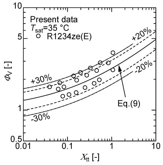 Figure 4 shows the present data of R1234ze(E) as the relationship between and . The experimental results of R1234ze(E) can be correlated to approximately ±30% by Equation (11), proposed by Hirose et al. [], with a two-phase pressure drop multiplier based on the obtained R32, R410A, and R152a of smooth and microfin tubes.