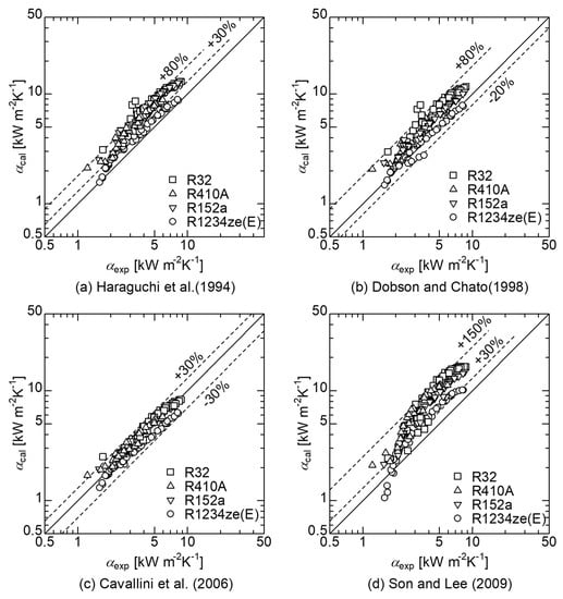 Figure 6a–d show the comparison of experimental values, including R1234ze(E), to values estimated from previous correlations, Haraguchi et al. [], Dobson and Chato [], Cavallini et al. [] and Son and Lee [], respectively. The Haraguchi et al. correlation, shown in Figure 6a, overestimates the experimental values by up to 80%. However, the predicted trends agree with the measured values. The Dobson and Chato correlation, shown in Figure 6b, overestimates the experimental values by up to 80%. However, the predicted trends agree with the measured values. Figure 6c shows that the experimental values and the values predicted by the Cavallini et al. correlation can be correlated within ±30%. Figure 6d shows that the Son and Lee correlation overestimates the experimental values by up to 150%.