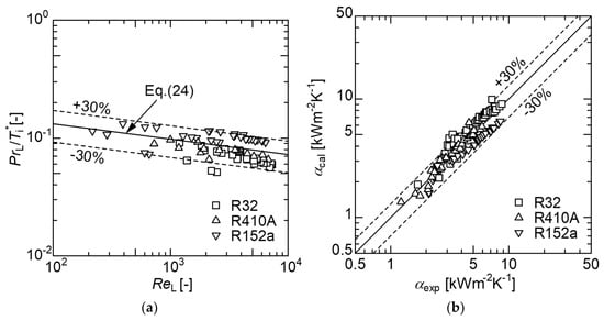 The correlation between the new equations and the measured data for a small-diameter smooth tube was shown in Figure 7b. From this, it is found that the new general correlation agrees well with the measured data of R32, R410A, and R152a, within approximately ±30%.