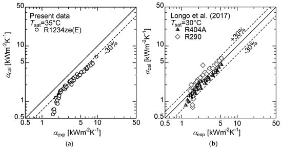 The comparison of results for R1234ze(E) for the small-diameter smooth tube was shown in Figure 8a. The predicted trend agrees with the measured values of R1234ze(E); however, the predicted value underestimates the experimental values by approximately −30%, particularly in the low wetness range. This is caused by the difference between the thermodynamic and transport properties of R1234ze(E), which is one of the low-pressure refrigerants, with the other refrigerants, which have an effect on condensation heat transfer. Figure 8b shows the comparison between the experimental data of Longo et al. [] and the present correlation for R404A and R290. The figure shows that the trends in the entire wetness region generally agree within ±30%; it was found that the present correlation can be applied to R404A and R290 refrigerants.