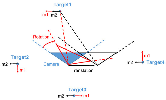 Another reason for using a full-view camera is that it improves the accuracy of SLAM methods. Because some different motions may have similar changes in an image of a limited FOV camera, these motions are discriminated with a full-view image. For example, as shown in Figure 2, the translation of a limited-view camera along the horizontal axis or rotation in the horizontal direction may result in the same movement for some features on images, i.e., Target 1 in Figure 2. However, for Targets 2–4, the camera motion causes different movements. This means that in some cases, different motions may be difficult to decouple from the observation of limited FOV images, while it is possible to distinguish from the observation of full-view images.