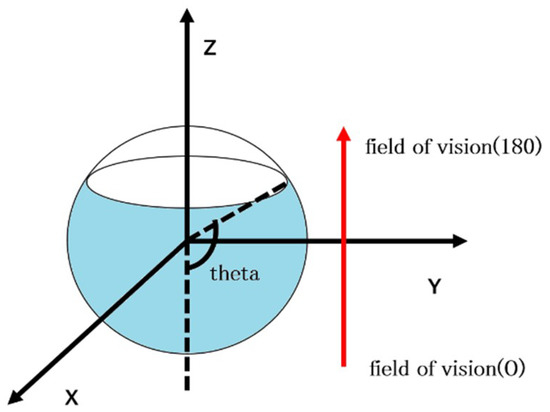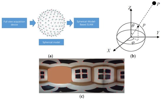 Next, we describe the spherical projection model. Suppose there is a sphere with a radius f and a point p in space, as shown in Figure 3b. The intersection of the sphere surface with the line joining point p and the center of the sphere is the projection of the point to the sphere. Suppose the ray direction of the projection is determined by a polar angle, , and an azimuth angle, , and the coordinates of a point p in space is
