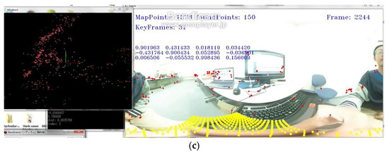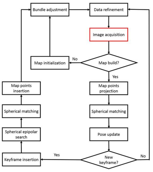 Our system is based on the map. When the system starts, we take two frames, which have a slight offset position between them, to perform the spherical match. Then, we represent feature points using the unit sphere polar coordinate (Equation (5)). Next, we employ the RANSAC five-point stereo algorithm to estimate an essential matrix. Finally, we triangulate the matched feature pair to compute the map point. The resulting map is refined through bundle adjustment [28].
