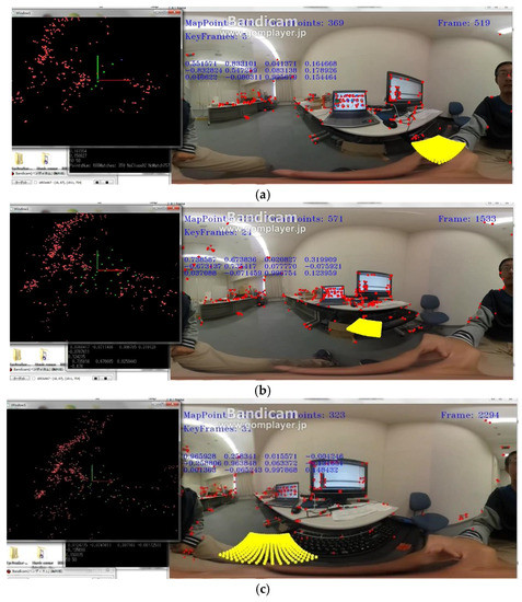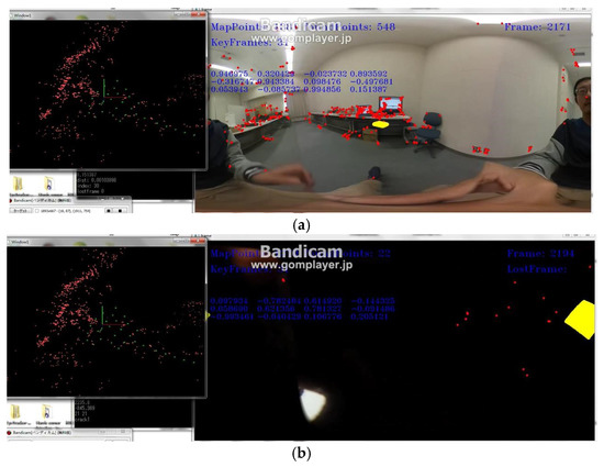 In the above omnidirectional-vision SLAM, although they used omnidirectional images, their images could still not obtain a view as wide as that of full-view images. Additionally, since processing such as feature extraction and feature matching was not conducted based on the spherical model, they used perspective projection. These approaches are not considered a spherical-model-based approach, according to a recent survey [16].