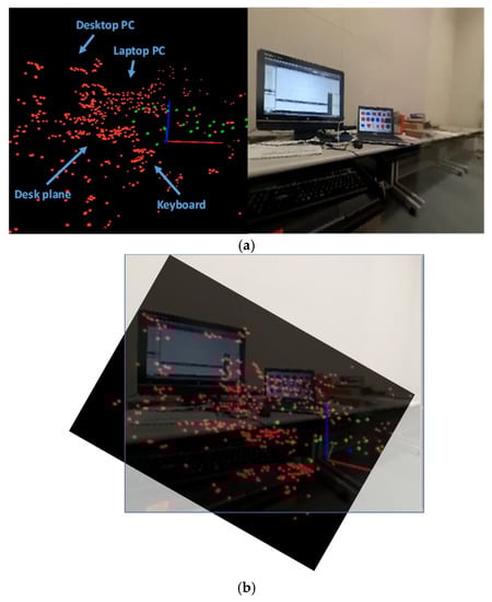 The map produced in the desk video. (a) map points and its corresponding real situation; (b) the map points are coincide with the real situation.