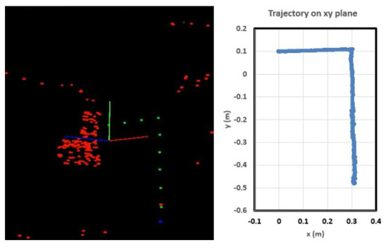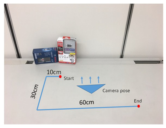 To validate our system further and compare with the limited-view method (PTAM), we measured routes in a space with sparse features, as shown in Figure 8. The camera moved from the starting point to the ending point with no rotation as quickly as possible. The first 10 cm was used for map initialization; we provided the real scale for the system. During the test, the limited-view SLAM failed because the environment was sparse. Only a few features were captured in limited views. We tested PTAM [1], one of the most famous limited-view SLAM approaches, on perspective images generated directly from full-view images. Figure 9 shows that PTAM failed to track in a sparse feature environment, which was a wall in this test. However, our full-view SLAM tracked well in this situation because it can capture features from other place except the wall. The final map is shown as the left image in Figure 10. Two boxes were defined in the final map. The coordinate system on the map was the world coordinate system, which was also the starting point in this test. Each green point represents a keyframe. The trajectory, which was very close to the ground truth, is shown as the right image in Figure 10. The video can be seen at https://youtu.be/c1ER1OqyjXM.