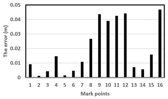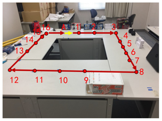 Then, we conducted an experiment to test our system’s accuracy in a larger environment. We planned a new, measured route, as shown in Figure 11. The camera moved in a clockwise loop through 16 marked points, we randomly put a few objects around the route to generate a sparse space, plus, no objects are put around points 9–12. Point A was the starting point. The first 10 cm from A to B was used for map initialization. Using continuous tracking and mapping, we obtained the distance between point A and every marked point. We measured the ground truth using a laser rangefinder. The final errors for every marked point using our method are shown in Table 1 and Figure 12. As seen in Table 1, the accuracy of marked points (8–12) decreased compared to the other points. The reason is that we set few trackable features around these marked points to simulate a sparse environment. Our proposed method is based on full-view images. It uses the features from every direction, so this had only a small influence on our system. However, limited-view based methods, such as PTAM [1], immediately failed to track at these points because of a limited view with few features. The result shows that our method tracked in a sparse environment, and that the accuracy of our method was sufficient. The average error was 0.02 m.