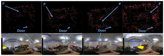 In this section, we demonstrate the performance of our system in real-world situations. We allowed the camera to move along the wall in a square in a room to build the map. Some sample frames are shown in Figure 13 to illustrate the formation of the map and the trajectory. We marked “P” on map images to define the current camera positions and marked “door” on both the full-view image and map image. Readers may find the relationship between the map and the real environment easier to understand using these markers. The final trajectory was a square as planned. The video is available at https://youtu.be/QzilX069U0M. The surrounding estimation and the trajectory were similar to that of the real environment.