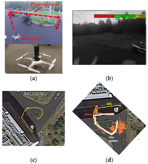 (a) full-view camera on the MAV; (b)PTAM performs badly as MAV rotates or in a sparse feature view; (c) GPS flight trajectory; (d) The flight trajectory by GPS, PTAM, and our system.
