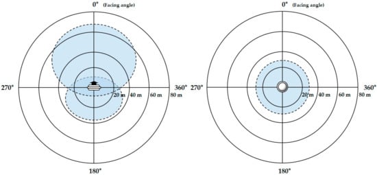 The transmission characteristics of Bluetooth beacons may vary depending on their orientation installation (Figure 2). For example, in the case of RECO beacons developed by Perples Inc. (Seoul, Korea), signals with transmission intensity set to −4 dBm can be propagated up to 70 m in front, 40 m to the back, and 30 m to the side of the beacon [20]. Signals propagating to the front and back of the beacon exhibit directionality, whereas those propagating to the side exhibit omnidirectionality. The proposed BBUNPROWS was designed to use omnidirectional signals generated from the sides of beacons, accomplished by attaching Bluetooth beacons in a horizontal orientation.