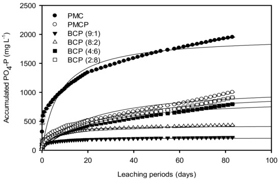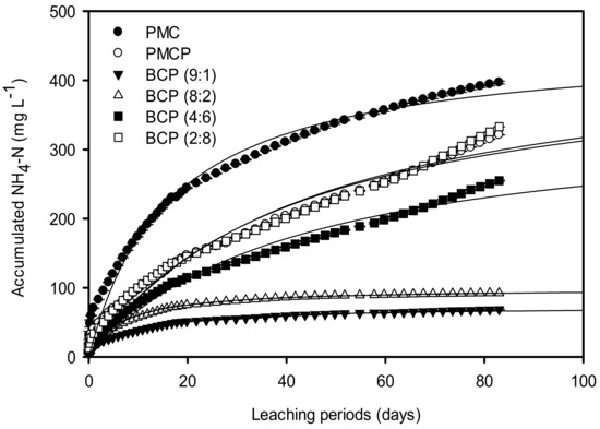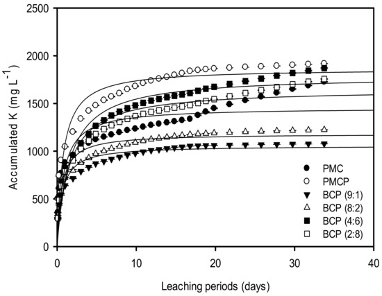 The highest accumulated amount of K in the PMCP was 1917 mg L−1 and the lowest in the BCP (9:1) was 1078 mg L−1. It appeared that accumulated amounts of K abruptly increased at the early leaching stage, and gradually increased at later stages (Figure 4).